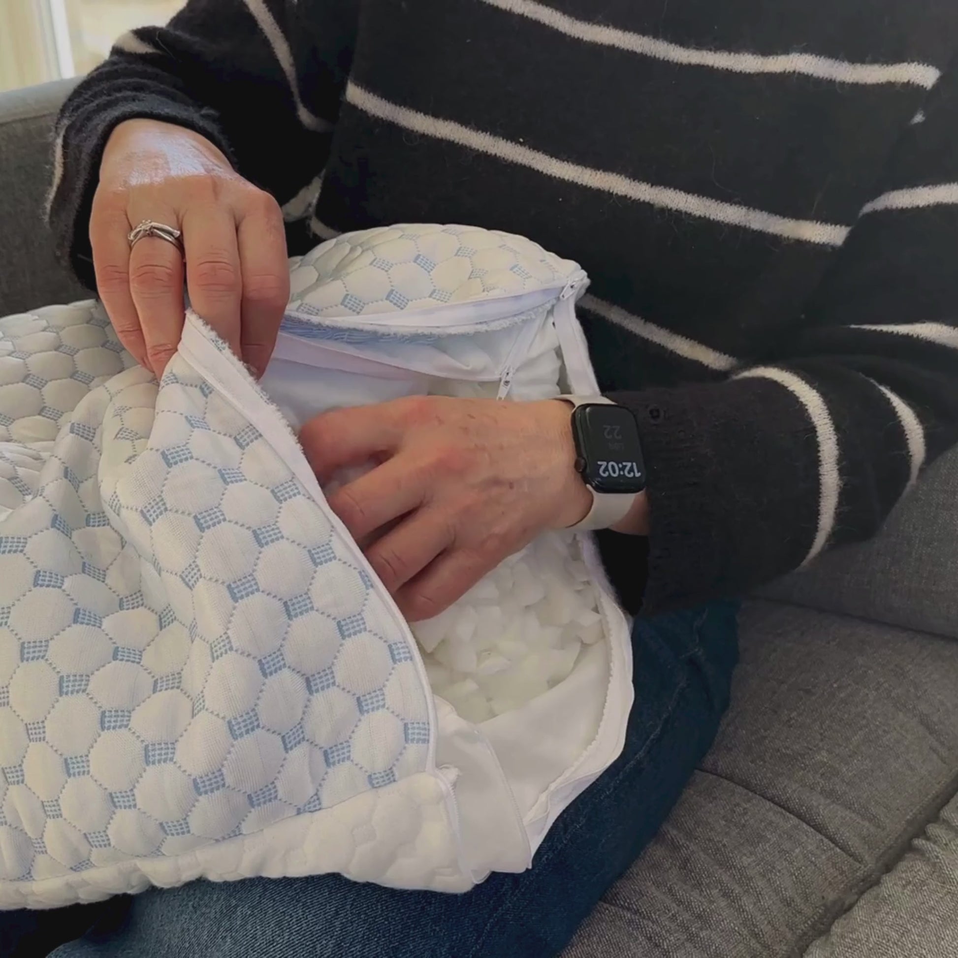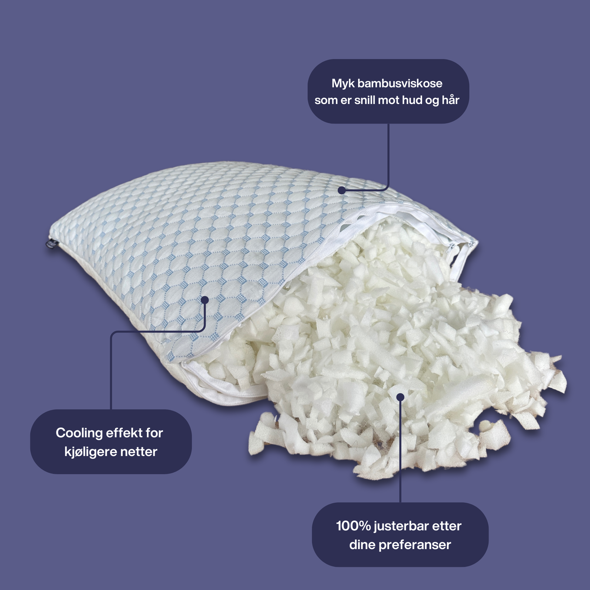 Vi har derfor utviklet en justerbar pute med hakket memory skum. Du kan enkelt tilpasse fyllet for å oppnå optimal støtte og høyde.